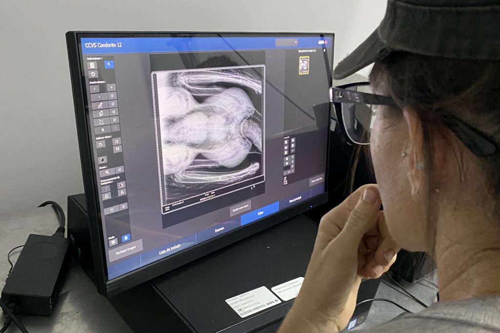 Un equipo del Centro de Conservación de Vida Silvestre arribó a la localidad serrana para su traslado a manos de veterinarios y cuidadores. Una vez llegado al CCVS se le realizó una revisión general. Los especialistas constataron que su plumaje y condición corporal eran buenos, sin signos de desnutrición. La herida, ubicada en la base de las plumas de la cola, tenía unos 15 centímetros de diámetro y entre 3 y 4 centímetros de profundidad. Aunque se sospecha que podría haber sido causada por un disparo, no se hallaron restos de plomo ni esquirlas en la zona. En la radiografía sí se detectó un perdigón antiguo en el ala izquierda, sin relación con la lesión actual.